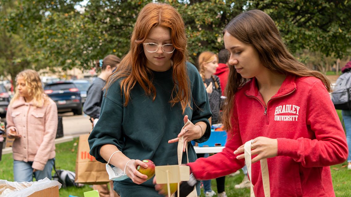 With seed funding from the Bradley University Family Association and support from Bradley’s Department of Family and Consumer Services, Peoria Grown acquires the fresh produce from Hy-Vee and sells them at or below cost.